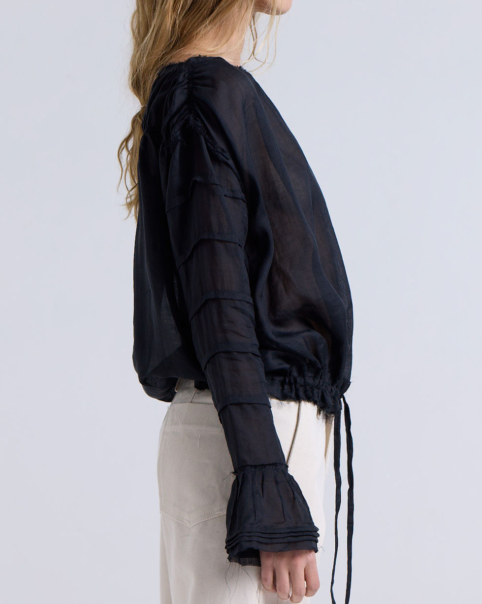 Top manga larga con ajuste en la cintura. Detalles de tablas en las mangas y puños. Terminación desflecada.